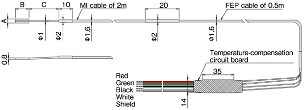 基底材料可選用 Inconel 600 或 SUS304,應依被測試材料選擇。 雖然採用由作用計與補償計組成的半橋式結構,但透過隨附的溫度補償電路板,可使用全橋方式進行量測。 最高操作溫度為靜態測量 600°C、動態測量 650°C。