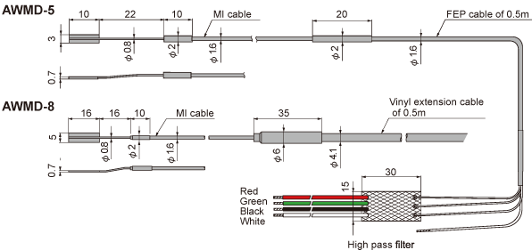 AWMD 可適用於最高 800°C,專為動態測量設計。 標準配件包含高通濾波器,能有效消除不必要的直流成分與低頻成分(如熱輸出、漂移等)。 建議搭配直流激勵型動態應變儀(DC-96A/DC-97A)、智慧型應變記錄器(DC-204R),或多通道記錄器 TMR-200 系列進行量測。