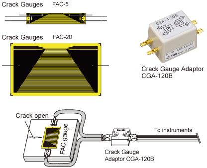 使用時,請事先將應變計黏貼於裂縫已發生或預測可能發生的位置。當裂縫擴展時,柵格線會依序斷裂,輸出值亦隨之變化。